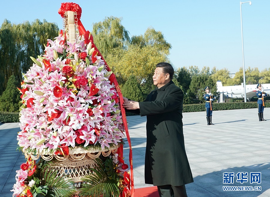 11月8日,中共中央總書(shū)記、國(guó)家主席、中央軍委主席習(xí)近平出席慶??哲姵闪?0周年主題活動(dòng),代表黨中央和中央軍委,對(duì)空軍成立70周年表示熱烈祝賀,向空軍全體官兵致以誠(chéng)摯問(wèn)候。這是習(xí)近平來(lái)到位于北京市昌平區(qū)的中國(guó)航空博物館,向人民空軍英烈敬獻(xiàn)花籃。 新華社記者 李剛 攝