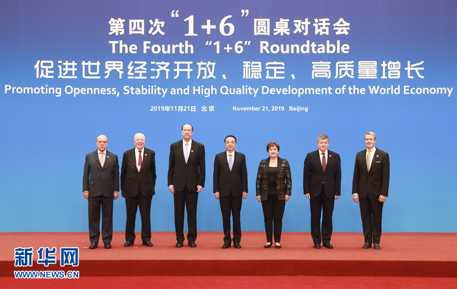 新華社北京11月21日電? 國(guó)務(wù)院總理李克強(qiáng)21日上午在釣魚(yú)臺(tái)國(guó)賓館同世界銀行行長(zhǎng)馬爾帕斯、國(guó)際貨幣基金組織總裁格奧爾基耶娃、世界貿(mào)易組織副總干事沃爾夫、國(guó)際勞工組織總干事賴德、經(jīng)濟(jì)合作與發(fā)展組織秘書(shū)長(zhǎng)古里亞和金融穩(wěn)定理事會(huì)主席夸爾斯舉行第四次“1+6”圓桌對(duì)話會(huì)。會(huì)議圍繞“促進(jìn)世界經(jīng)濟(jì)開(kāi)放、穩(wěn)定、高質(zhì)量增長(zhǎng)”的主題,就優(yōu)化營(yíng)商環(huán)境和推進(jìn)更高水平開(kāi)放等議題深入交流。