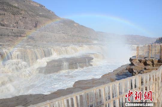 資料圖:小雪時(shí)節(jié),黃河壺口瀑布出現(xiàn)冰掛,天空中伴有一道彩虹。 張建良 攝