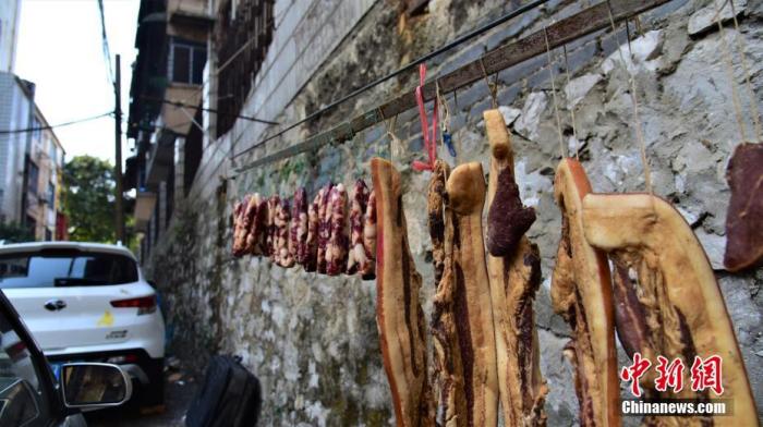 資料圖:居民直接把臘肉和臘腸掛在路邊停車位的旁邊。王以照 攝