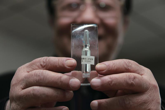 趙鎧院士手持基因工程乙肝疫苗樣品。默沙東官網(wǎng)