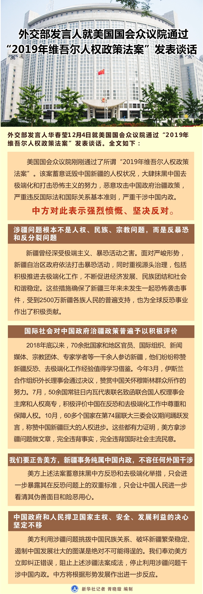 全國(guó)人大外事委員會(huì)就美國(guó)國(guó)會(huì)眾議院通過(guò)“2019年維吾爾人權(quán)政策法案”發(fā)表聲明