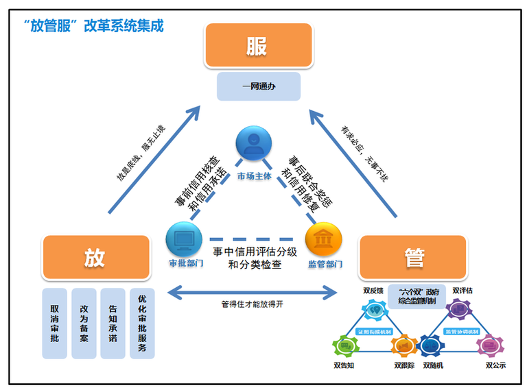 注重系統(tǒng)集成,突出協(xié)同高效。“大道至簡,實干為要?!被仡櫳虾J衅謻|新區(qū)“證照分離”改革歷程,始終堅持以“減證”促“簡政”,在行政審批上做“減法”,把“放手”當(dāng)作最大的“抓手”,同時加強事中事后監(jiān)管,堅持“放手”但不“甩手”,持續(xù)推進政府職能深刻轉(zhuǎn)變。在“放”的方面,著重體現(xiàn)“一個轉(zhuǎn)變、兩個確立”:一個轉(zhuǎn)變即轉(zhuǎn)變審批管理模式,從重事前準(zhǔn)入審核轉(zhuǎn)為重事中事后監(jiān)管;兩個確立即確立清單管理制度,將涉企經(jīng)營許可事項全部納入清單管理,清單之外,企業(yè)取得營業(yè)執(zhí)照即可自主開展經(jīng)營;確立“四扇門”改革方式,取消審批的注重協(xié)同配套,改為備案的注重當(dāng)場辦結(jié),告知承諾的注重信用支撐,優(yōu)化審批服務(wù)的注重簡便透明。在“管”的方面,探索確立了“雙告知、雙反饋、雙跟蹤、雙隨機、雙評估、雙公示”的“六個雙”政府全程閉環(huán)綜合監(jiān)管新模式。在“服”的方面,強化“互聯(lián)網(wǎng)+政務(wù)服務(wù)”融合創(chuàng)新,推動政府管理創(chuàng)新與信息技術(shù)深度融合,依托“一網(wǎng)通辦”推進政務(wù)服務(wù)扁平化、便捷化、智能化,讓數(shù)據(jù)多跑路、群眾少跑腿。(見下圖)