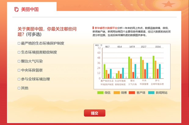 綠水青山是你我都關注的熱點。在新華網推出的2019全國兩會熱點調查中,新華睿思大數(shù)據通過監(jiān)測新聞網站、論壇、微信、微博、APP、平媒6個信源,分析結果顯示,全國兩會開幕以來,關于生態(tài)環(huán)境的話題共832 4987個。