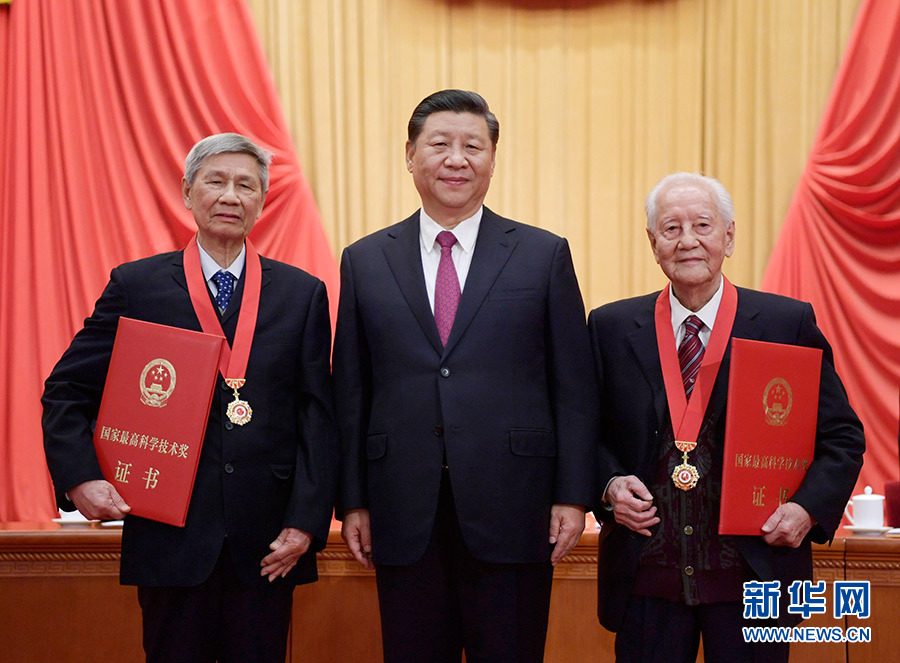 1月10日,2019年度國(guó)家科學(xué)技術(shù)獎(jiǎng)勵(lì)大會(huì)在北京人民大會(huì)堂隆重舉行。中共中央總書(shū)記、國(guó)家主席、中央軍委主席習(xí)近平向獲得2019年度國(guó)家最高科學(xué)技術(shù)獎(jiǎng)的原中國(guó)船舶重工集團(tuán)公司第七一九研究所黃旭華院士(右)和中國(guó)科學(xué)院大氣物理研究所曾慶存院士(左)頒獎(jiǎng)。 新華社記者 謝環(huán)馳 攝