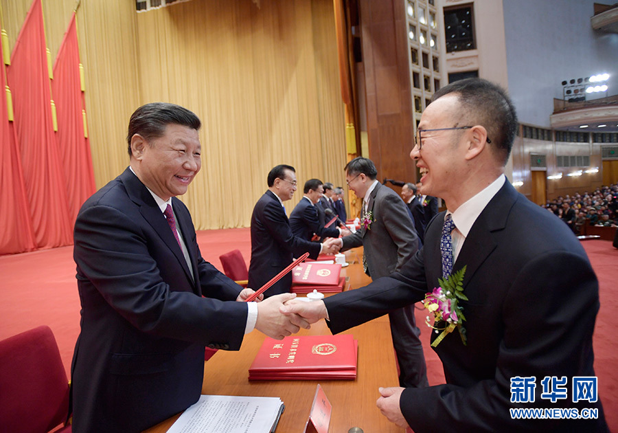 1月10日,2019年度國(guó)家科學(xué)技術(shù)獎(jiǎng)勵(lì)大會(huì)在北京人民大會(huì)堂隆重舉行。這是中共中央總書(shū)記、國(guó)家主席、中央軍委主席習(xí)近平向獲獎(jiǎng)代表頒發(fā)證書(shū)。 新華社發(fā)(盛佳鵬 攝)