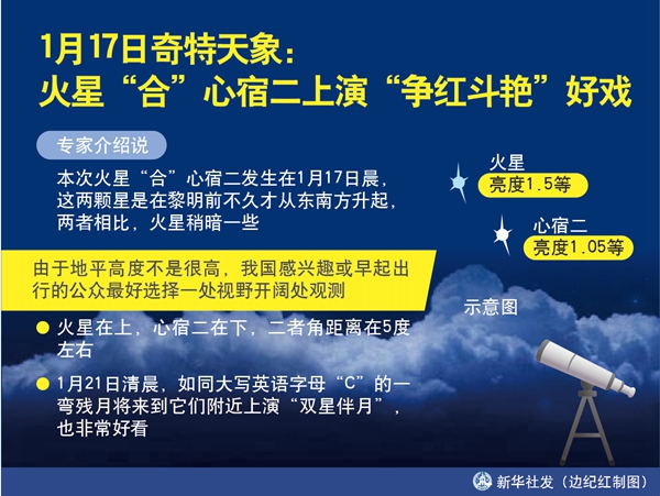 新華社天津1月15日電(記者周潤?。┨煳膶<医榻B,17日晨,火星“合”心宿二這一奇特天象將現(xiàn)身天宇。屆時,如果天氣晴好,我國感興趣的公眾可以看到這兩顆紅色的星星近距離爭輝,上演“爭紅斗艷”的好戲。