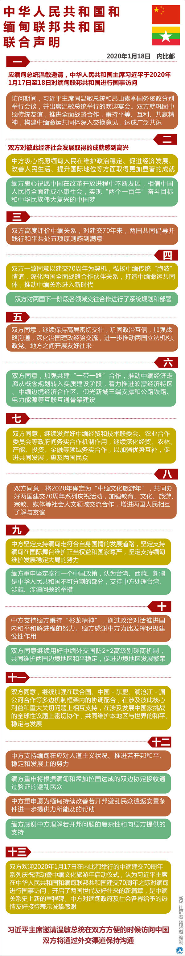 十三、雙方歡迎2020年1月17日在內(nèi)比都舉行的中緬建交70周年系列慶?;顒郁咧芯捨幕糜文陠觾x式,認(rèn)為習(xí)近平主席在中華人民共和國和緬甸聯(lián)邦共和國建交70周年之際對緬甸進行國事訪問,開啟了兩國世代友好往來的新篇章,是中緬關(guān)系史上新的里程碑。中方對緬甸政府及社會各界給予的熱情友好接待表示誠摯感謝。