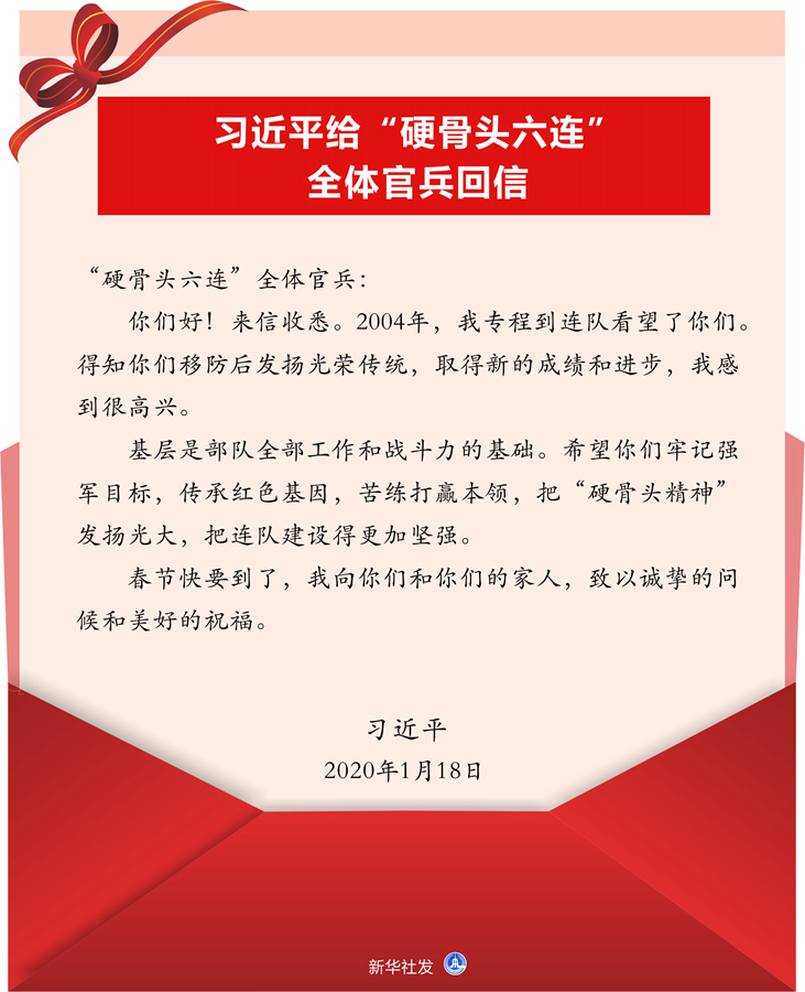 習(xí)近平給“硬骨頭六連”全體官兵回信 勉勵(lì)他們把“硬骨頭精神”發(fā)揚(yáng)光大 把連隊(duì)建設(shè)得更加堅(jiān)強(qiáng)