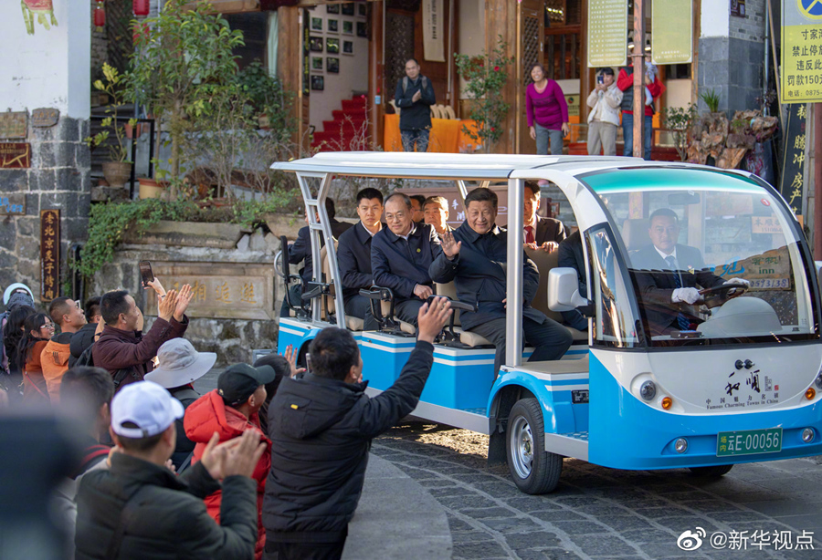 習(xí)近平總書記19日下午前往騰沖和順古鎮(zhèn)考察調(diào)研。他來到和順圖書館,察看古絲路上崇文尚教的優(yōu)良傳統(tǒng)。他沿著古鎮(zhèn)小巷步行,走進“大馬幫博物館”,詳細了解西南絲路古道歷史和近代以來騰沖對外交流史。沿途游客看到總書記,熱情簇擁上來,習(xí)近平同他們親切打招呼,詢問大家都來自哪里?在七彩云南走了哪些地方?有游客問:“習(xí)大大,彭麻麻呢?”總書記笑著回答說:“沒來。過年了都在家里忙著呢!”大家都會心笑了起來。古鎮(zhèn)里暖意融融,笑聲陣陣。(文字記者:張曉松、朱基釵 攝影記者:鞠鵬、謝環(huán)馳、燕雁)