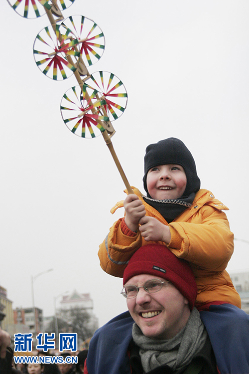 廟會上,風(fēng)車清脆的鼓聲、飛舞的彩輪