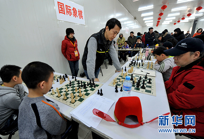 2013年2月13日,在北京龍?zhí)稄R會上,國際象棋大師李文良與多名業(yè)余棋手下棋。(圖片來源:新華社)