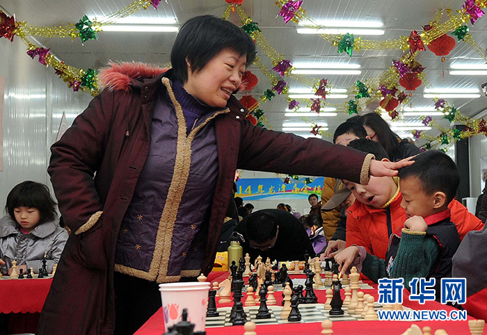 2014年2月4日,國際象棋世界冠軍謝軍(左)在龍?zhí)稄R會活動現(xiàn)場與一位小朋友交流。(圖片來源:新華社 記者 公磊攝)