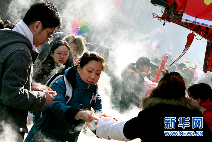 2008年2月6日,游客在北京地壇春節(jié)廟會上挑選風(fēng)味小吃。(圖片來源:新華社 張迺杰攝)