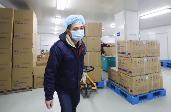 1月23日,在浙江省德清縣湖州莫干山高新技術產(chǎn)業(yè)開發(fā)區(qū)一口罩公司生產(chǎn)車間,工作人員在拉運成箱的口罩。近日,各地口罩生產(chǎn)企業(yè)克服春節(jié)期間用工困難,抓緊生產(chǎn),全力增加市場供應。新華社發(fā)(王正攝)