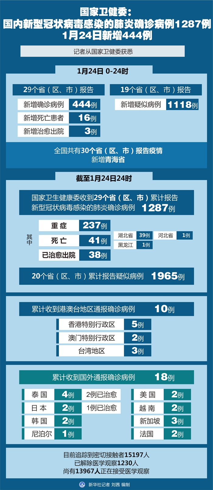 截至1月24日24時(shí),國(guó)家衛(wèi)健委收到29個(gè)?。▍^(qū)、市)累計(jì)報(bào)告新型冠狀病毒感染的肺炎確診病例1287例,其中重癥237例,死亡41例(湖北省39例、河北省1例、黑龍江1例)。已治愈出院38例。20個(gè)?。▍^(qū)、市)累計(jì)報(bào)告疑似病例1965例。