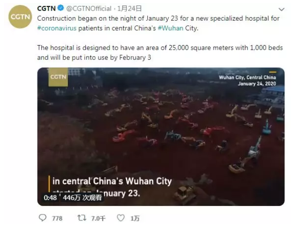 昨晚,CGTN在推特發(fā)布的一條關(guān)于武漢火神山醫(yī)院工地施工現(xiàn)場的視頻一舉沖上該平臺國際新聞首頁熱門,觀看量超446萬,超過153萬的全球網(wǎng)友參與互動。