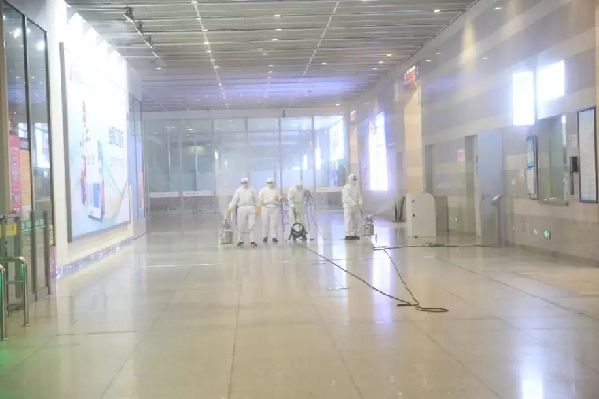 防疫人員正在對(duì)車站進(jìn)行消毒。戴昊君 攝