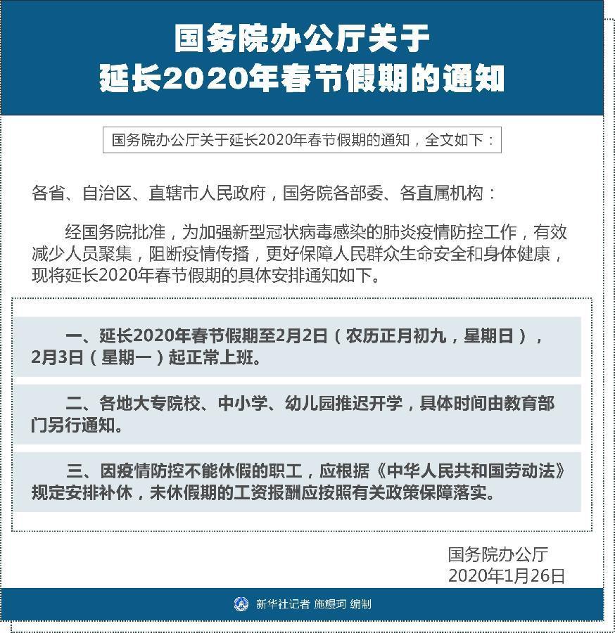 經(jīng)國(guó)務(wù)院批準(zhǔn),為加強(qiáng)新型冠狀病毒感染的肺炎疫情防控工作,有效減少人員聚集,阻斷疫情傳播,更好保障人民群眾生命安全和身體健康,現(xiàn)將延長(zhǎng)2020年春節(jié)假期的具體安排通知如下。
