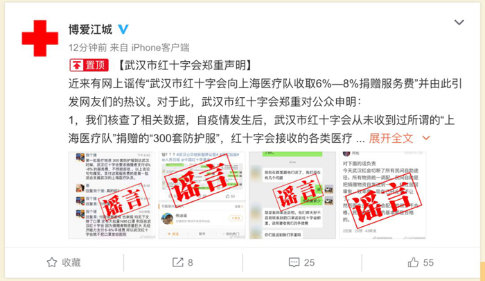 武漢市紅十字會(huì)呼吁廣大網(wǎng)友,不要讓謠言玷污了各界愛(ài)心企業(yè)和愛(ài)心人士的善意之舉,疫情面前,不信謠、不傳謠,眾志成城,共渡難關(guān)。