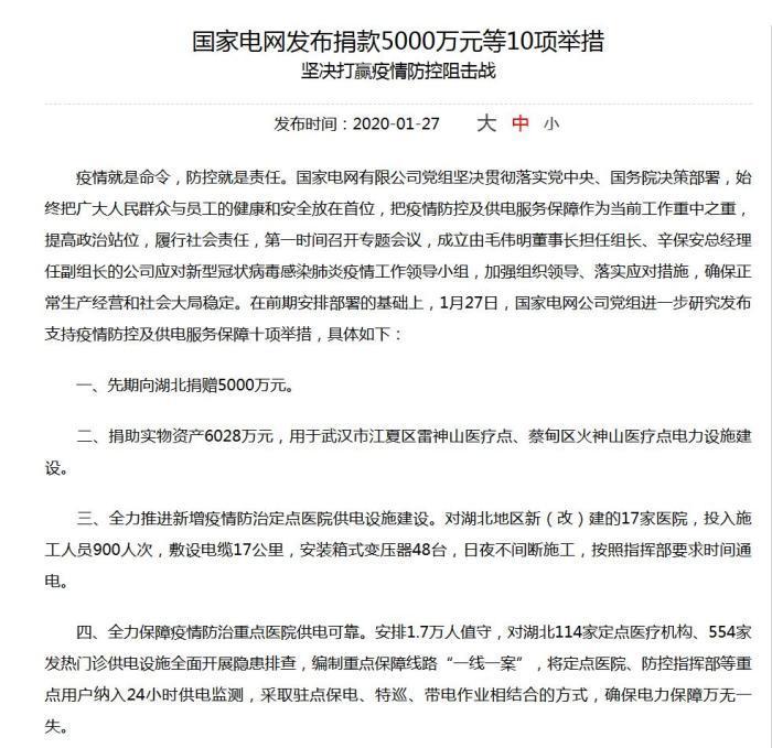 在前期安排部署的基礎(chǔ)上,1月27日,國家電網(wǎng)公司黨組進(jìn)一步研究發(fā)布支持疫情防控及供電服務(wù)保障十項舉措,具體如下: