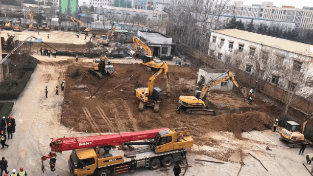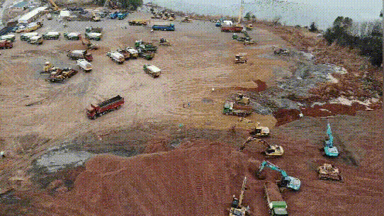 經(jīng)過一天一夜施工,新型冠狀病毒隔離房項目入場挖機(jī)41臺,推土機(jī)15臺,壓路機(jī)4臺,自卸車40臺,327名管理人員和336名工人集結(jié)完畢,累計平整全部場地9000平方米,內(nèi)轉(zhuǎn)土方2500立方米。