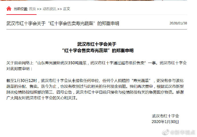 關(guān)于目前網(wǎng)絡(luò)上“山東壽光援助武漢350噸蔬菜,武漢市紅十字通過(guò)超市低價(jià)售賣”一事,武漢市紅十字會(huì)發(fā)表申明,詳情如下↓(記者王鵬) ????