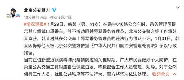 據(jù)@北京公交警方剛剛發(fā)布的消息,1月29日,韓某(男,41歲)在乘坐616路公交車時,乘務管理員提示其應佩戴口罩乘車,其不聽勸阻并辱罵乘務管理員。北京公交警方經(jīng)工作將韓某查獲,韓某對其在公交車上辱罵乘務管理員的違法行為供認不諱。