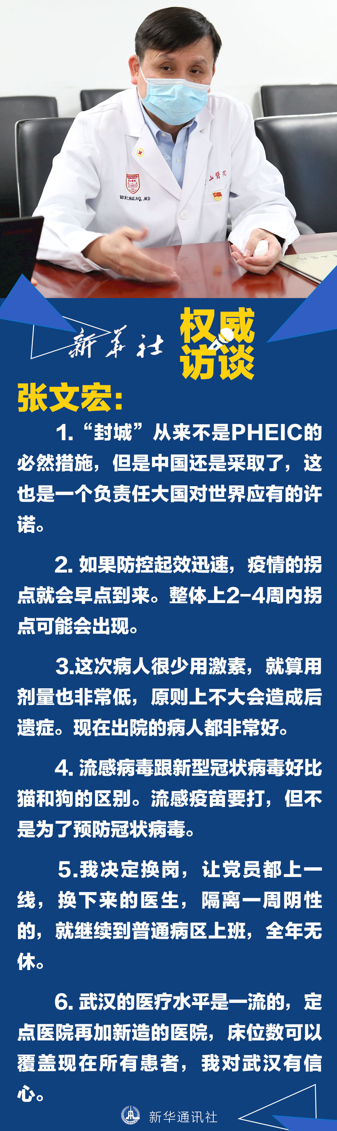 近日,上海醫(yī)療救治專(zhuān)家組組長(zhǎng)、復(fù)旦大學(xué)附屬華山醫(yī)院感染科主任張文宏面對(duì)記者采訪(fǎng)說(shuō)的這些話(huà),使他成為網(wǎng)民心中的“硬核”醫(yī)生。1月31日,張文宏在接受新華社記者的專(zhuān)訪(fǎng)時(shí)表示,疫情來(lái)了,堅(jiān)守崗位是醫(yī)生的職責(zé)所在。
