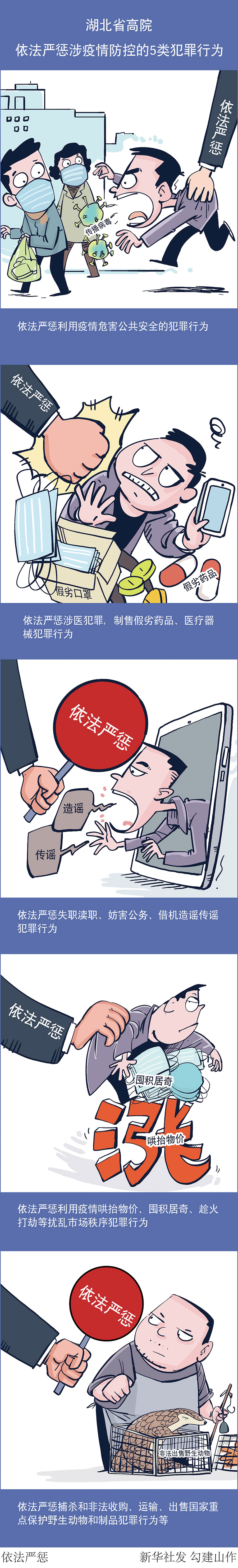 新華社武漢2月5日電(記者梁建強)記者5日從湖北省高級人民法院獲悉,湖北省高院已制訂下發(fā)《關(guān)于充分發(fā)揮審判職能為新型冠狀病毒感染的肺炎疫情防控提供司法保障和服務(wù)的意見》,要求各級法院認真落實黨中央、國務(wù)院、最高人民法院和湖北省委、省政府關(guān)于疫情防控相關(guān)決策部署,充分發(fā)揮審判職能作用,切實維護社會穩(wěn)定,保護廣大人民群眾的生命健康安全和合法權(quán)益。其中,明確了5類將依法嚴懲的刑事犯罪類型。