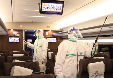 2月4日,中國(guó)鐵路北京局集團(tuán)有限公司對(duì)返回北京動(dòng)車段的復(fù)興號(hào)進(jìn)行車內(nèi)消毒作業(yè)。張晴/攝