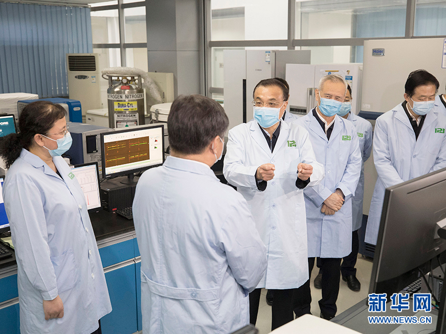 2月9日,中共中央政治局常委、國務(wù)院總理、中央應(yīng)對新冠肺炎疫情工作領(lǐng)導(dǎo)小組組長李克強(qiáng)赴中國醫(yī)學(xué)科學(xué)院病原生物學(xué)研究所,考察疫情防控科研攻關(guān),慰問一線科研人員。這是李克強(qiáng)在實(shí)驗(yàn)室詳細(xì)了解抗病毒藥物篩選等情況。 新華社記者 王曄 攝