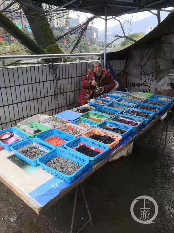 倪素英老人原本在萬新農貿市場門口擺攤,賣紐扣、針線、鞋墊一類的百貨用品。