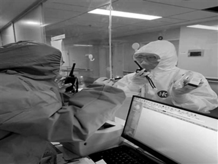 兩位醫(yī)護(hù)人員隔著玻璃用對(duì)講機(jī)交流。