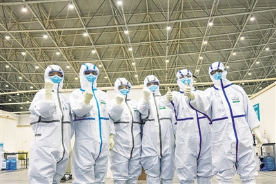 2月10日,在武漢客廳方艙醫(yī)院,幾名醫(yī)護(hù)人員為自己打氣。新華社記者 熊琦攝