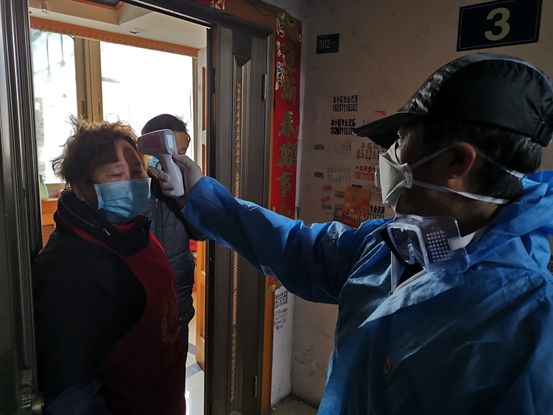 聞超在給社區(qū)居民測量體溫