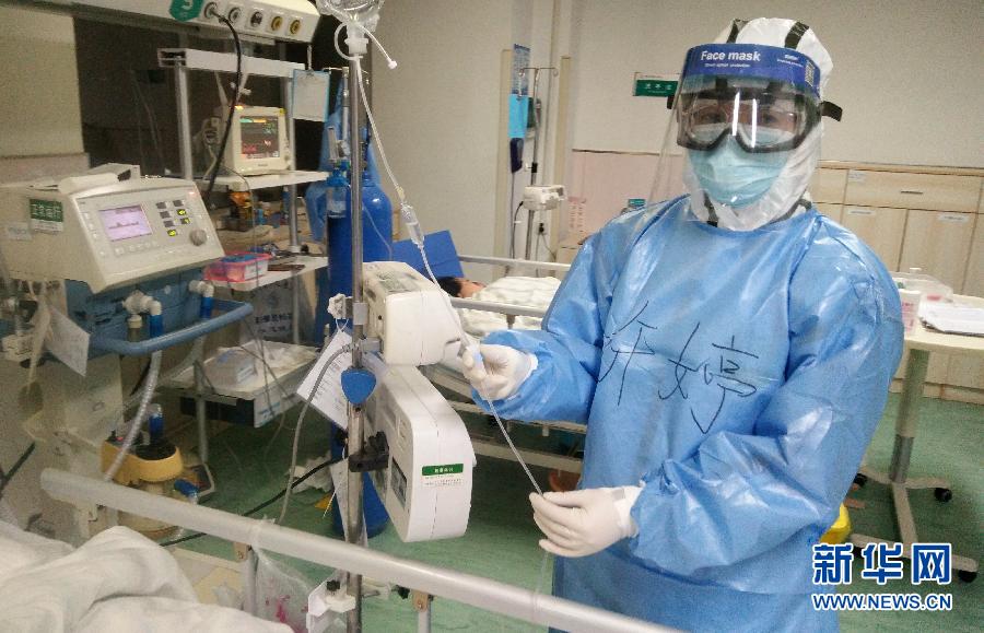 在武漢市第九醫(yī)院重癥監(jiān)護室,共產(chǎn)黨員、西安市胸科醫(yī)院ICU主管護師許婷在工作(2月1日攝)。 新華社發(fā)