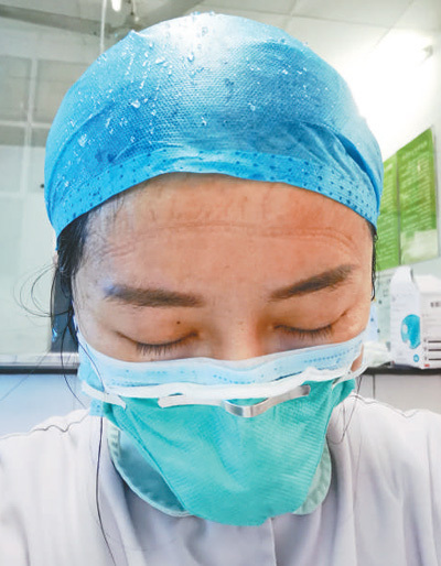 武警湖北總隊(duì)醫(yī)院衛(wèi)生防疫科“90后”護(hù)士肖瑞,堅(jiān)守在防疫一線已有20多天。圖為忙碌了一天的肖瑞,走出病房脫下隔離衣,豆大的汗珠掛滿一次性工作帽,額頭上的勒痕清晰可見。吳 君 王云可攝影報(bào)道