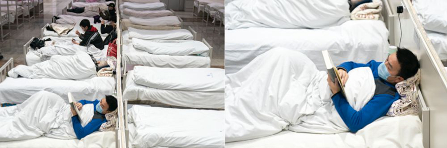 這些身影中還有被隔離的病人。江漢方艙醫(yī)院啟用的第一天,收治的首批病人里,有一個面目清秀的小伙子。入院躺下后,他打開了一本《政治秩序的起源》,安靜地閱讀。口罩遮住了他的表情,但卻藏不住眼神里的平靜和專注。看見我舉起相機,他輕輕擺了擺手,示意不用拍他,我猶豫片刻,還是執(zhí)意按下了快門。也許他并不明白,在有些喧囂的方艙醫(yī)院里,近乎靜止的他,是多么的令人震撼。