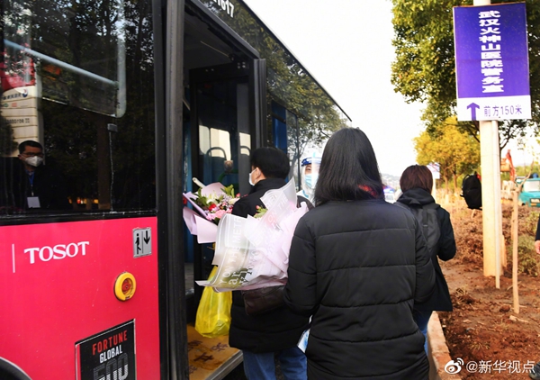 經(jīng)過火神山醫(yī)院醫(yī)護(hù)人員的精心診治,首批7名符合出院標(biāo)準(zhǔn)的新冠肺炎確診患者13日下午出院?;鹕裆结t(yī)院籌備工作指揮部統(tǒng)一安排車輛將患者分別送回所居住小區(qū)門口。