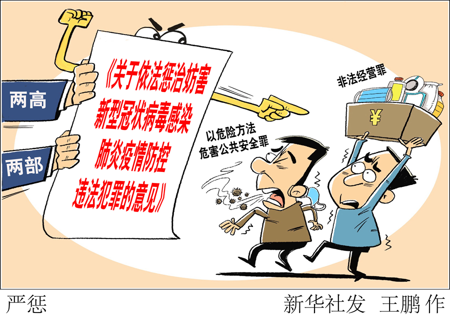 2月10日,最高人民法院、最高人民檢察院、公安部、司法部聯(lián)合發(fā)布關(guān)于依法懲治妨害新型冠狀病毒感染肺炎疫情防控違法犯罪的意見,針對當(dāng)前突出的涉疫情防控違法犯罪,統(tǒng)一執(zhí)法標(biāo)準(zhǔn)、程序、依據(jù),并強(qiáng)調(diào)加強(qiáng)治安管理、市場監(jiān)管等執(zhí)法工作,加大對暴力傷醫(yī)違法犯罪行為打擊力度。 新華社發(fā) 王鵬 作