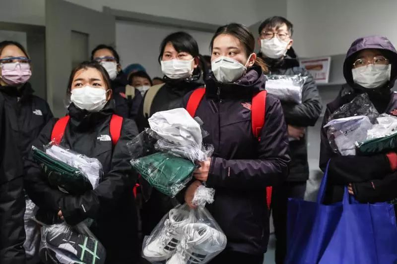 (在前往醫(yī)院前,隊員們在駐地領取病房工作服)