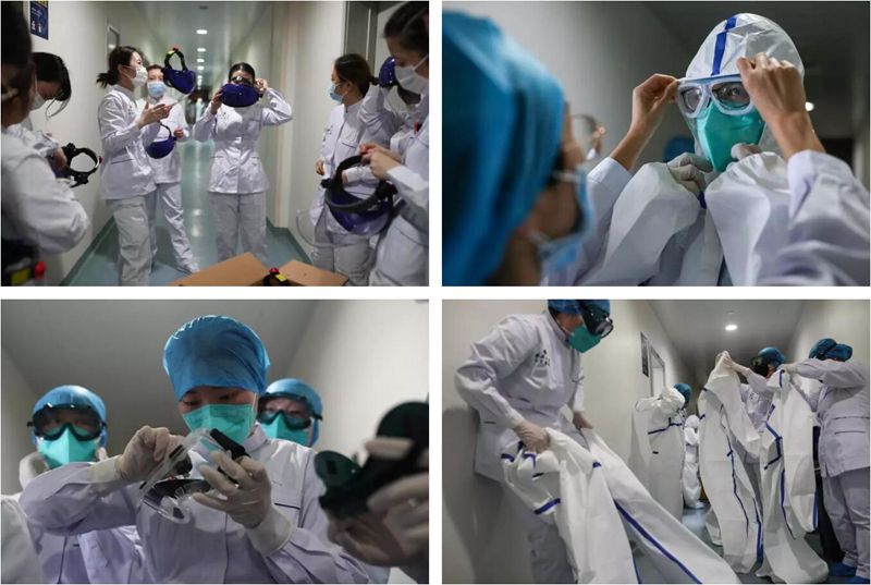 穿防護服的步驟非常重要,因為只有穿的順序做對了,脫防護服時才不會接觸到污染源。每一步都攸關生命,容不得半點差錯。一些年輕護士由于身材過于瘦小,而防護服又很大,她們會用橡皮筋把防護服仔仔細細扎嚴實再進病房。