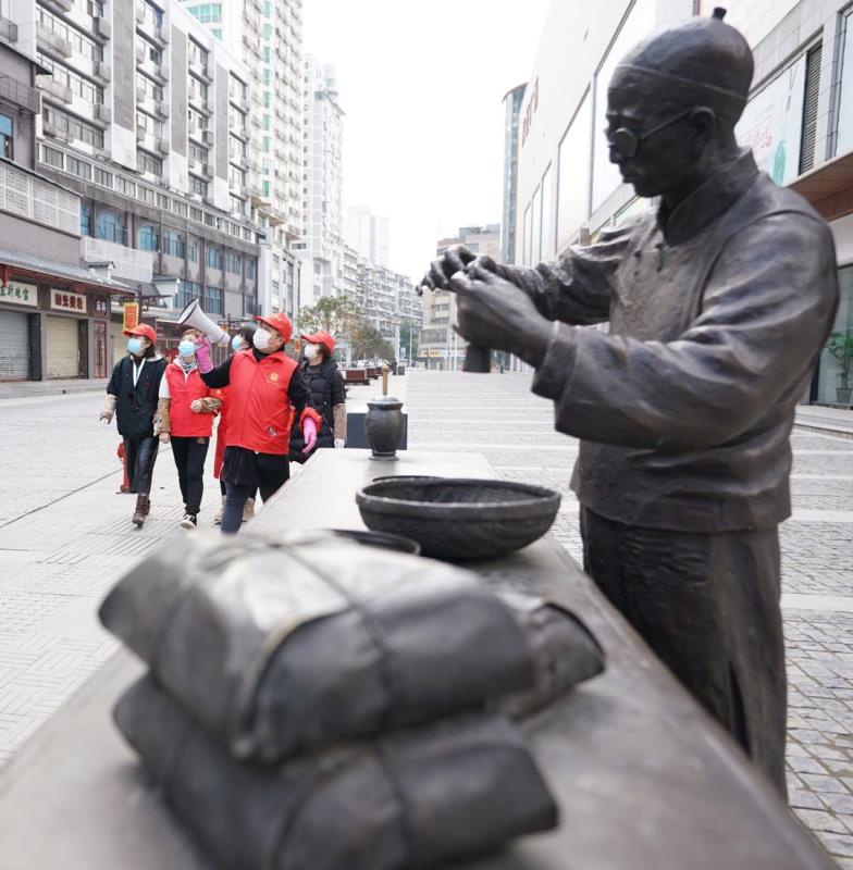 戰(zhàn)“疫”中的漢正街,看不到開(kāi)門(mén)的商戶,很難想像高峰時(shí)漢正街的小商品綜合市場(chǎng)曾經(jīng)有60多個(gè)專業(yè)市場(chǎng)、30多萬(wàn)種商品。街頭行人不多,不時(shí)能看到街道、社區(qū)干部做宣傳或是為居民服務(wù)。胡亞非介紹說(shuō),漢正街轄區(qū)面積1.67平方公里,下轄19個(gè)社區(qū)。此次疫情開(kāi)始正值春節(jié)之前,10多萬(wàn)流動(dòng)人口返鄉(xiāng),目前常住居民1000余戶,2.6萬(wàn)多人口。
