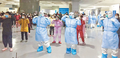 2月12日,武漢國際會展中心方艙醫(yī)院,醫(yī)護(hù)人員和患者一起跳舞。程少文攝(影像中國)
