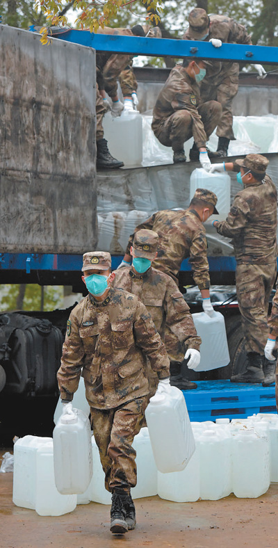 2月10日,河北邯鄲市一家愛(ài)心組織為火神山醫(yī)院捐贈(zèng)的百?lài)嶀t(yī)用消毒原液運(yùn)抵武漢并予交接,圖為醫(yī)療隊(duì)隊(duì)員在快速搬運(yùn)醫(yī)療物資。范顯海攝(新華社發(fā))