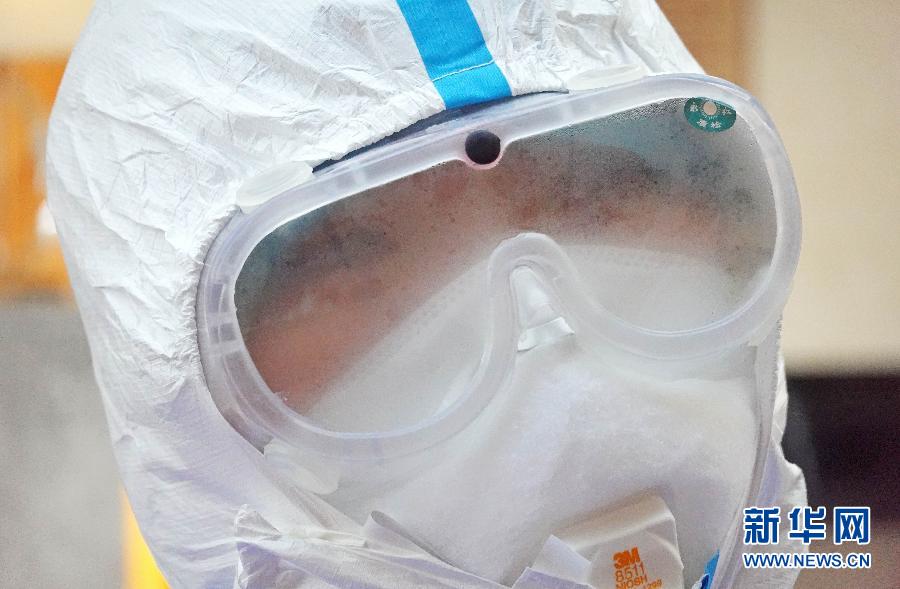 1月29日,北京宣武醫(yī)院一名醫(yī)護(hù)人員在武漢駐地練習(xí)防護(hù)技能時(shí)護(hù)目鏡內(nèi)充滿霧氣。 新華社記者 才揚(yáng) 攝