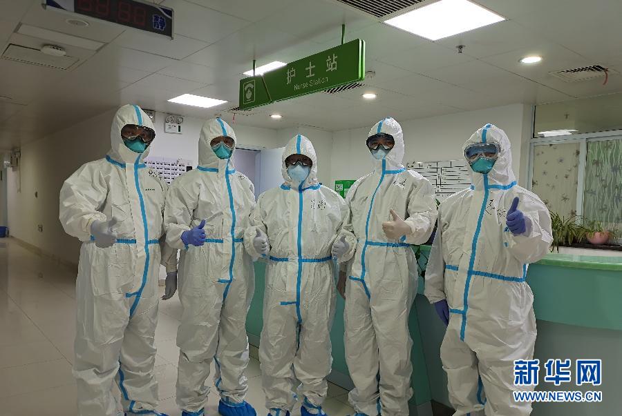 毛青(左二)和同事在金銀潭醫(yī)院一線病房工作時(shí)合影(1月26日攝)。 新華社發(fā)