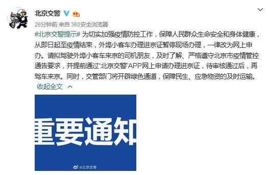 警方提醒,請(qǐng)擬駕駛外埠小客車來(lái)京的司機(jī)朋友,及時(shí)了解、嚴(yán)格遵守北京市疫情管控通告要求,并提前通過(guò)“北京交警”APP網(wǎng)上申請(qǐng)辦理進(jìn)京證,待審核通過(guò)后,再駕車來(lái)京。同時(shí),交管部門將開(kāi)辟綠色通道,保障民生、應(yīng)急物資的及時(shí)運(yùn)輸。