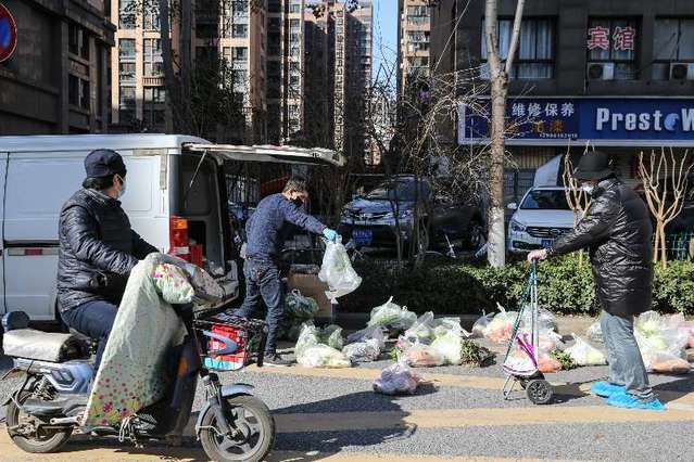 2月16日,湖北省武漢市,送菜小哥許可(中)在卸貨。中青報(bào)·中青網(wǎng)記者 趙迪攝